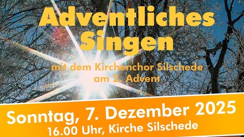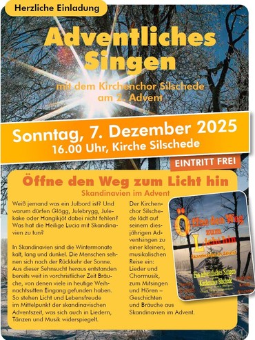 Der Kirchenchor Silschede lädt auf seinem diesjährigen Adventsingen zu einer kleinen, musikalischen Reise ein: Lieder und Chormusik, zum Mitsingen und Hören – Geschichten und Bräuche aus Skandinavien im Advent.